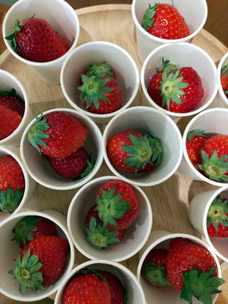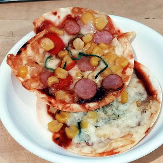 | おやつは、ぎょうざの皮を使った小さいピザと いちごでした。 |