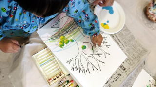 青と黄色の絵具を ポンポンでスタンプしたら 元気な緑の葉っぱが 描けました。 |